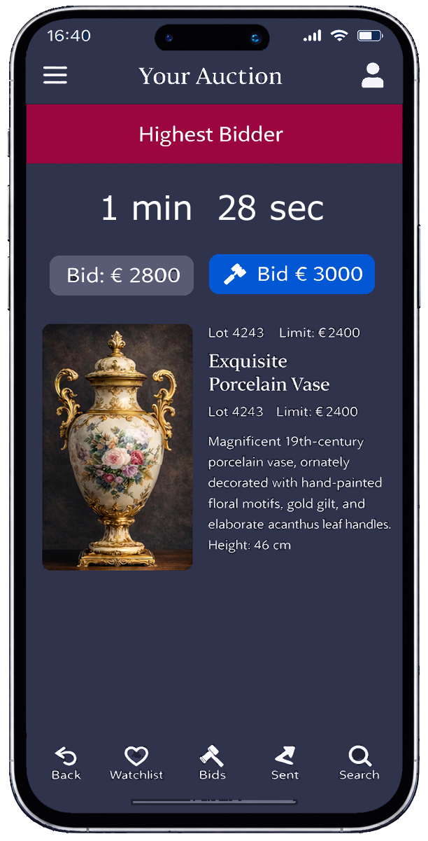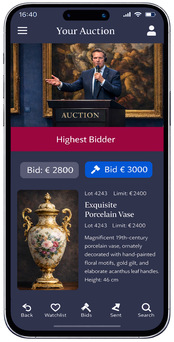 With the auction house console, you can additionally broadcast classic in-person auctions online – synchronously and transparently. Employees of your auction house operate the console and transmit bidding steps, awarded bids, and lot changes in real-time. Online bidders can follow the auction via video and place live bids through the website or app without delay, as if they were sitting directly in the hall. In this area, concealed bidding steps can also be implemented, such as through automatic bidding agent bids. Online bidders can see at any time whether they are the current highest bidder, whether the leading bid comes from the hall, or was possibly placed via an external live console, and can raise their bid at any time.