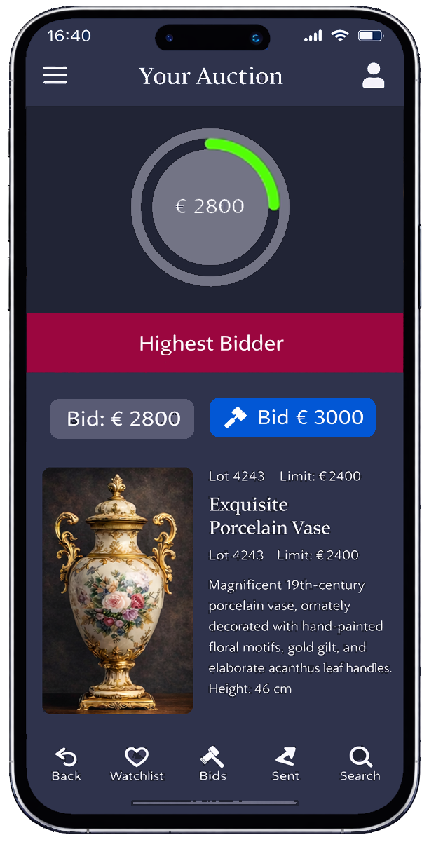 If you use the app, bidders also receive push alerts – e.g., when a bid is placed, outbid, auction win, or shortly before a lot expires. This significantly increases participation because users don't have to constantly check in but are reminded at just the right moment.
